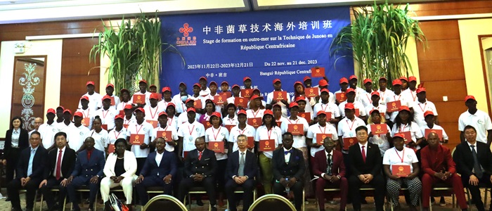 2023年12月21日,援中非菌草技术海外培训班结束了为期30天的培训任务并在中非首都班吉举办了隆重的结业仪式。朱正洪参赞受邀出席结业仪式,向培训班学员颁发荣誉证书并发表讲话。福建农林大学国家菌草工程技术研究中心副主任刘庆华教授,中非农业和农村发展部办公厅主任、中非国家先锋青年组织高级委员、经济计划部亚洲合作处处长、中非农研所所长以及来自来总统府、总理府、外交部、议会中非农业部、各省农研所、中非农业发展署、班吉大学、非政府组织格鲁费帕等单位的55名中非学员参加此次活动。